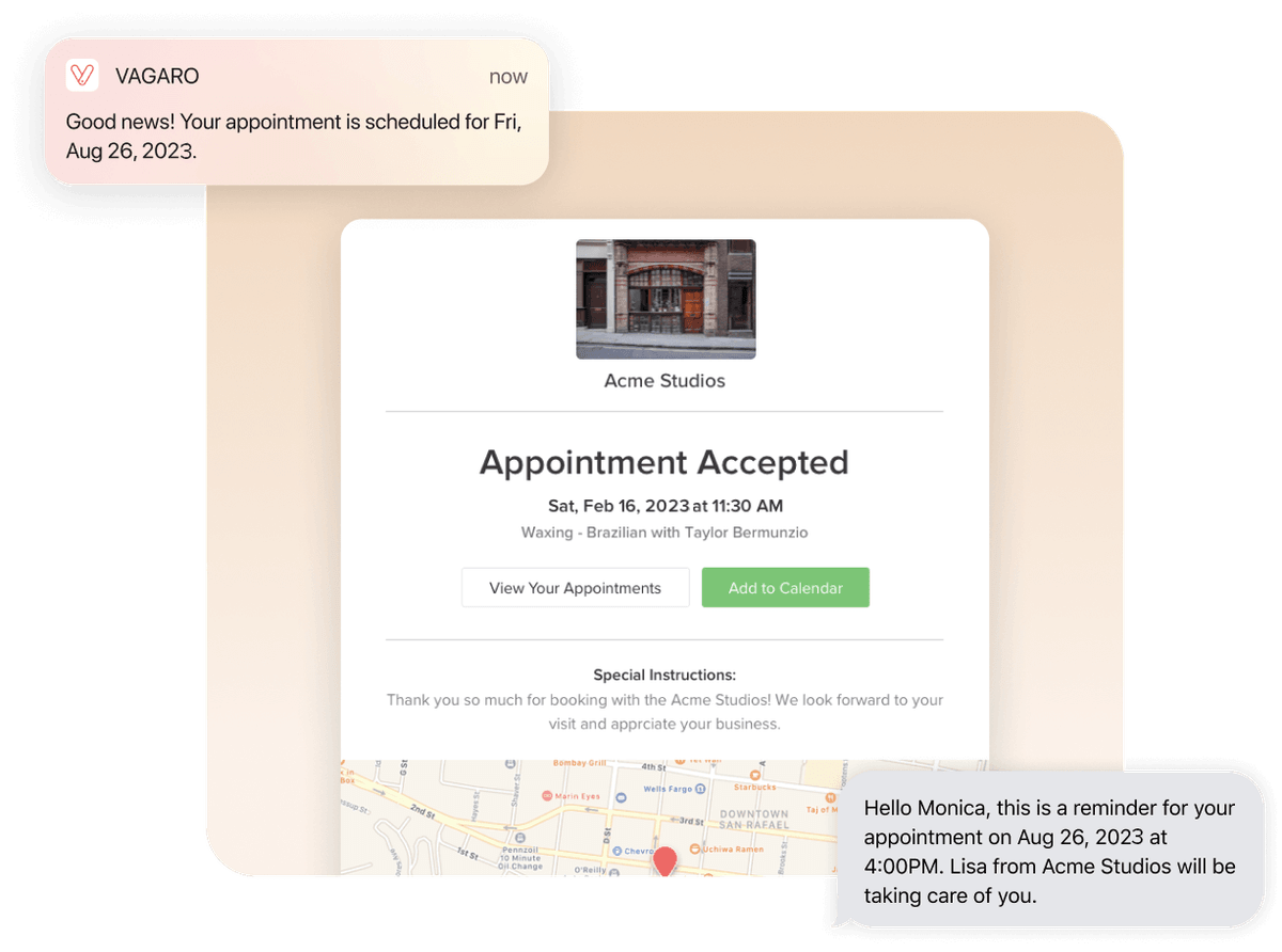 Once your clients install the Vagaro client app, they will instantly be notified about anything relating to their appointments and even your last-minute promotions. Clients will be able to add the appointments to their phone calendar in seconds.