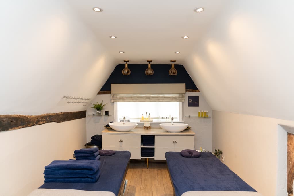 Describe the floorplan, treatment rooms, waiting area, reception desk, and any added amenities or features.
