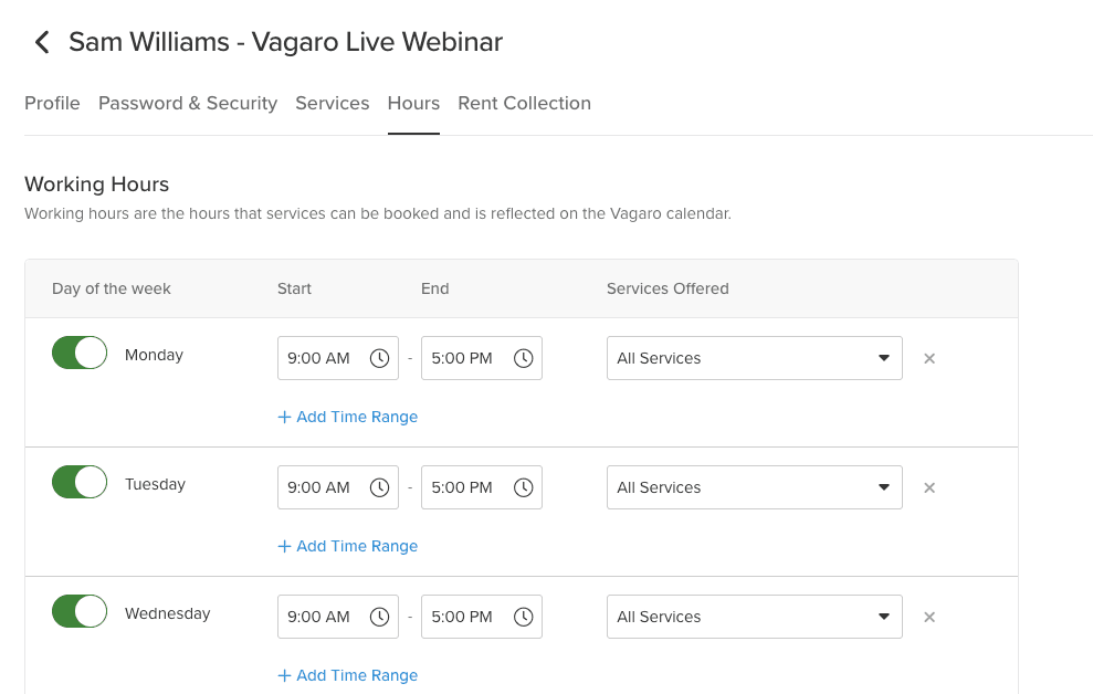 You’ll want to head to the Employee Profiles section of Vagaro first, whether you’re using the app or a computer. Within your individual Vagaro Employee Profile, you’ll now have the option to select the days and/or hours that you perform specific services: