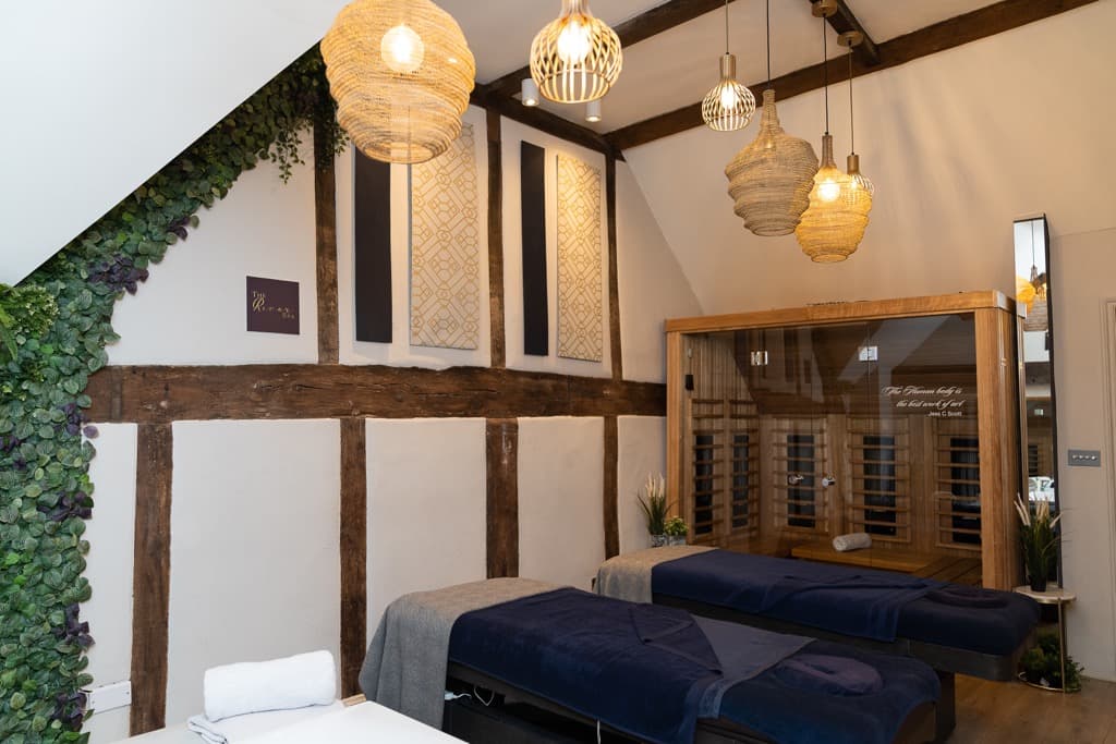 Describe the layout and design of your spa, including floor plan, interior design elements, and how the space is optimized for a relaxing and comfortable experience.