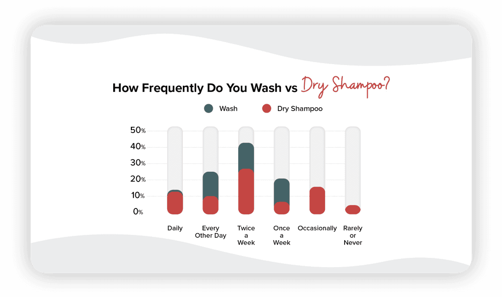We already covered how people often use dry shampoo because they don’t have time for a full wash, or don’t have ready access to water when you’re out & about. But dry shampoo shouldn’t be thought of as a last resort, as our survey illustrates. Most respondents dry-shampoo their hair with some regularity, in some cases more often than they wash it in a week.