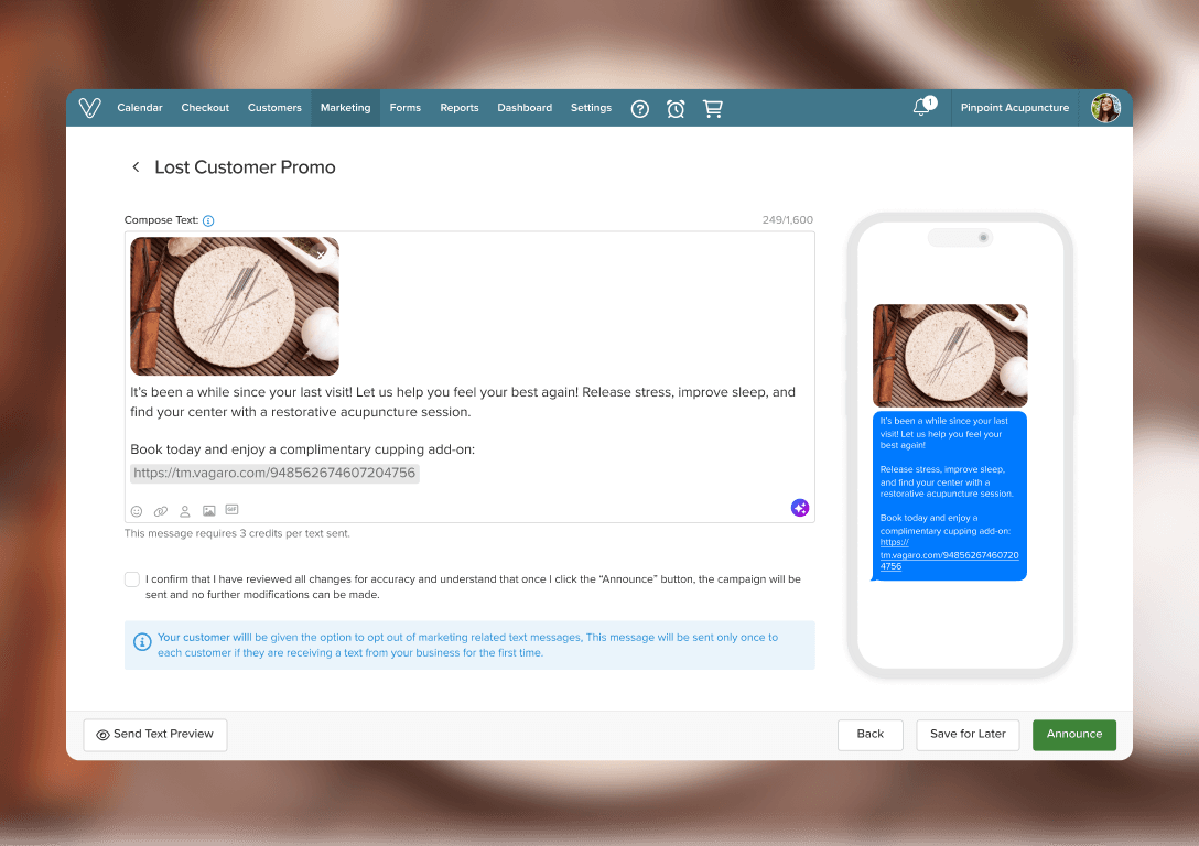 Yes. Vagaro’s acupuncture scheduling software lets patients book appointments online 24/7, reducing phone calls and keeping your schedule full.