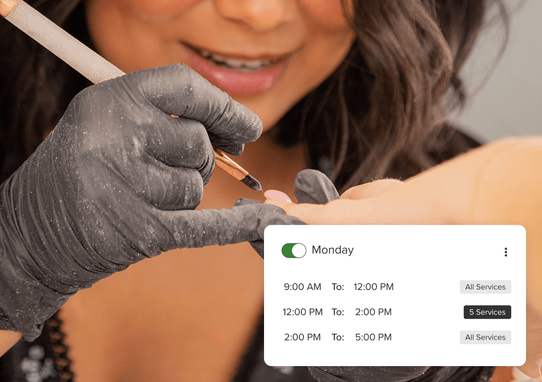 Control your schedule by service, day, or time. Clients can only book what you allow, when you allow it.
