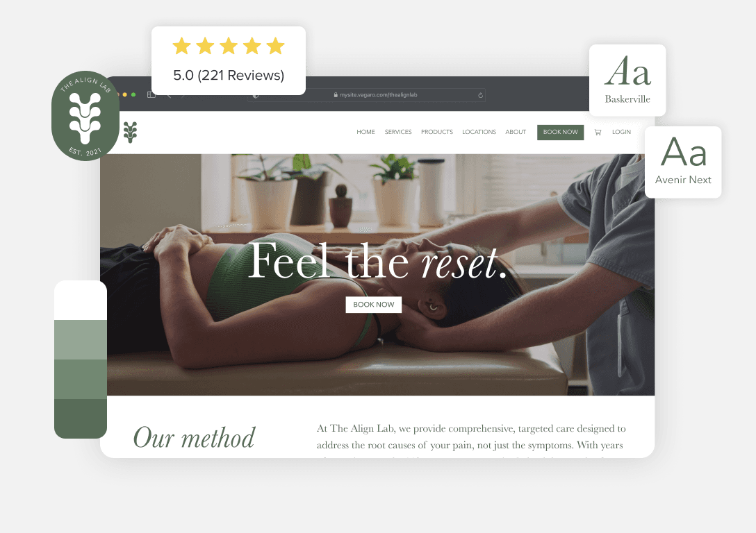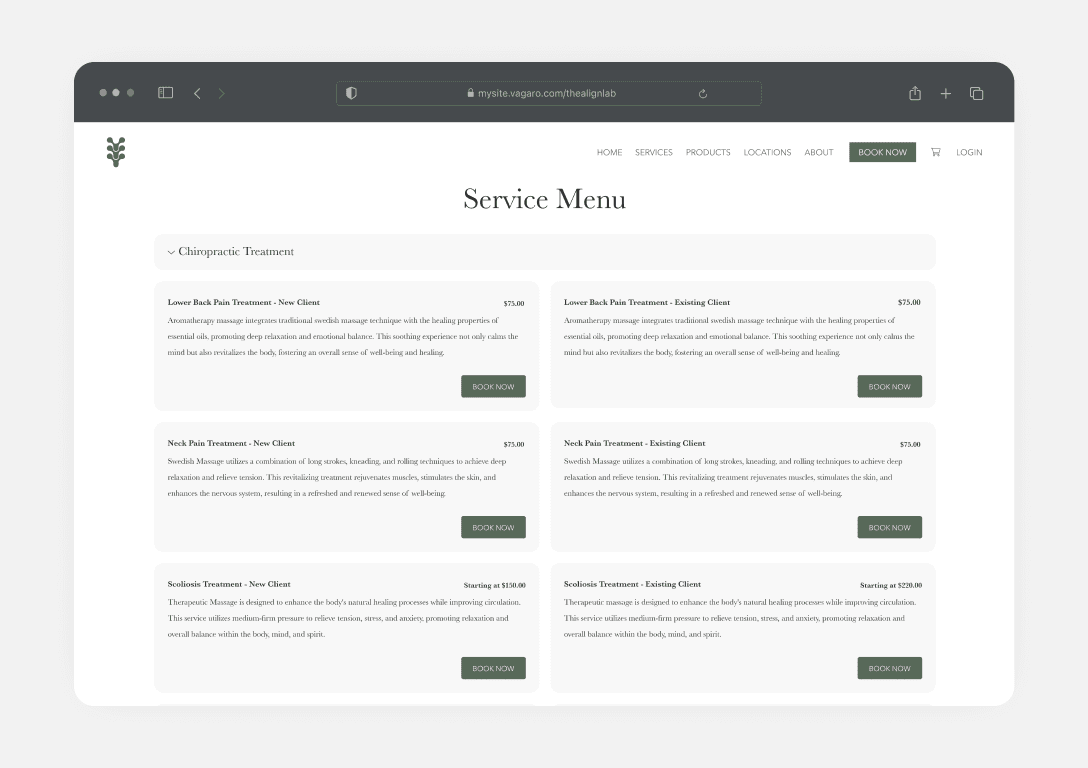 Add a Vagaro booking widget directly to your existing site or build a new one fully integrated with your chiropractor software. Your schedule updates automatically so patients can book in real time.
